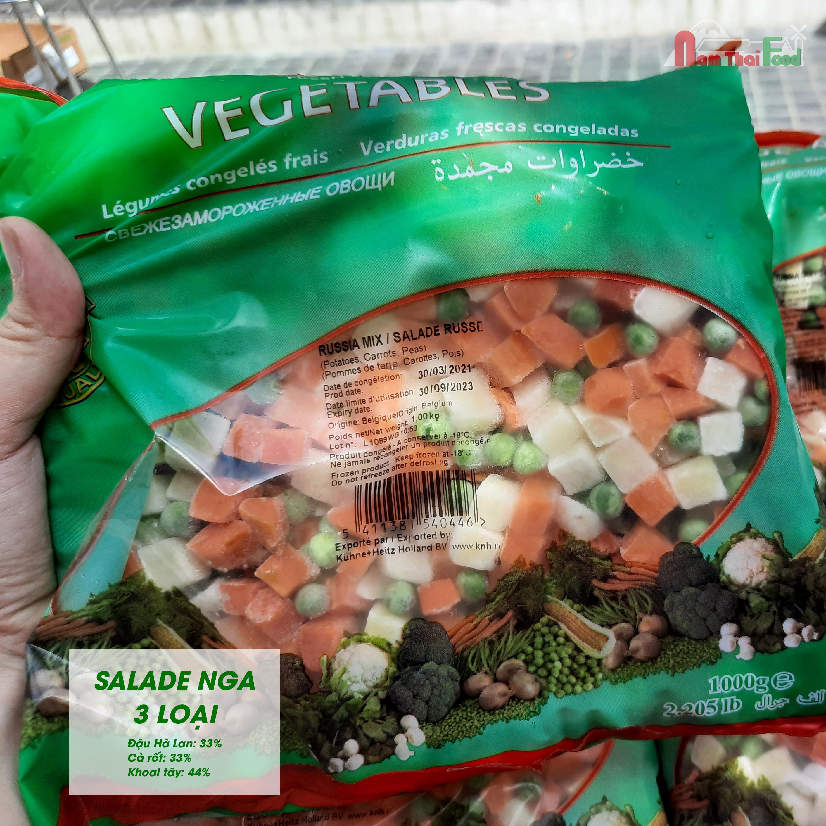 Salade Nga hỗn hợp 3 loại là sự kết hợp 3 loại rau củ tươi ngon đậu Hà Lan, ngô ngọt và khoai tây. Salade Nga hỗn hợp với 100% rau củ quả tươi đậu Hà Lan, ngô ngọt và khoai tây được qua cấp đông nhanh, giữ nguyên đầy đủ các chất dinh dưỡng. Trong đó 33% là đậu Hà Lan, 33% ngô ngọt và 44% khoai tây